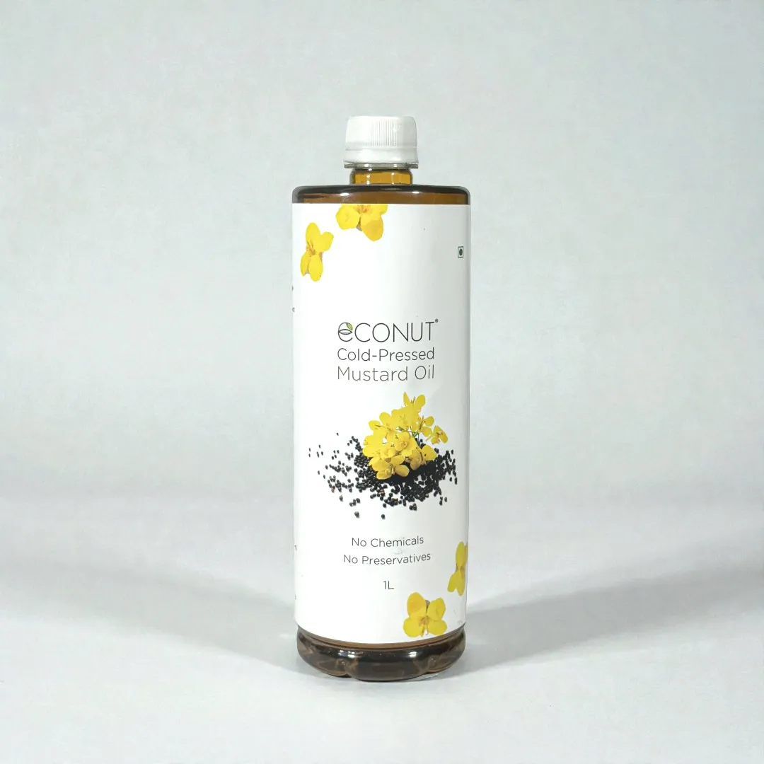 Econut Cold-Pressed Mustard oil is extracted by crushing red mustard seeds under normal room temperatures using a hydraulic press. The end product of cold pressing mustard seeds is obtained strictly after precipitation and filtration. The taste of cold-pressed mustard oil is easily discernible and has a lot of advantages over mustard oil that is produced otherwise. Econut is a manufacturer of very high-quality cold-pressed mustard oil which has manifold utilities both in the kitchen and beyond. Scientifically oil has about 60% monounsaturated fatty acids(MUFA)(42% erucic acid and 12% oleic acid); it has about 21% polyunsaturated fats(PUFA) (6% the omega-3 alpha-linolenic acid(ALA) and 15% omega-6 linoleic acid(LA)) and it has about 12% saturated fats. It is rich in mono saturated fatty acids making it heart friendly and also helps in managing cholesterol; It relieves sinus congestion and invigorates digestion