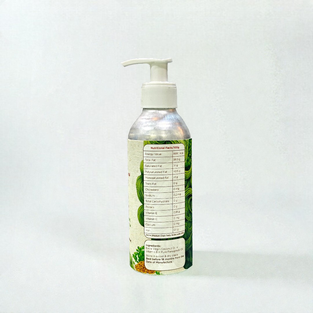 Our Fenugreek Infusion is a oremium hair oil that combines the enriching properties of fenugreek essential oil with deep moisturizing benefits of Virgin Coconut Oil enriched with vitam E.